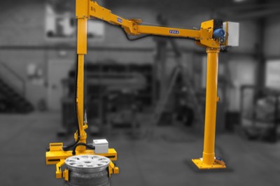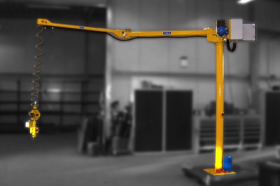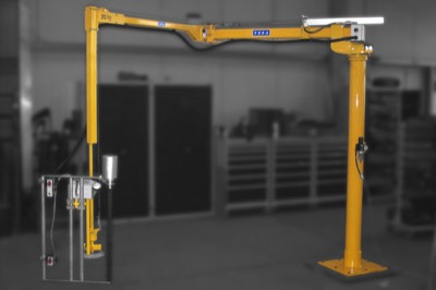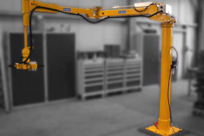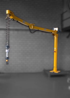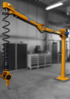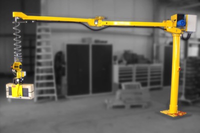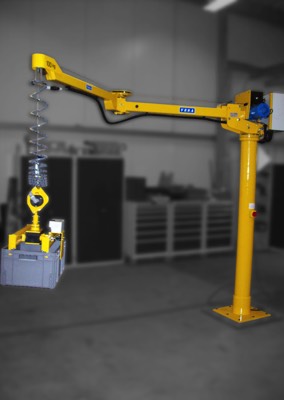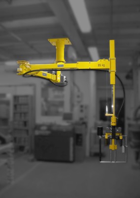 Der Knickgelenkausleger gewährleistet ein äußerst leichtgängiges Schwenken des Auslegerarms, da die Masse des Hubmotors nicht mit bewegt werden muß. Zudem kann der Arm aufgrund seines Gelenkes beispielsweise auch in Maschinenfenster eintauchen.